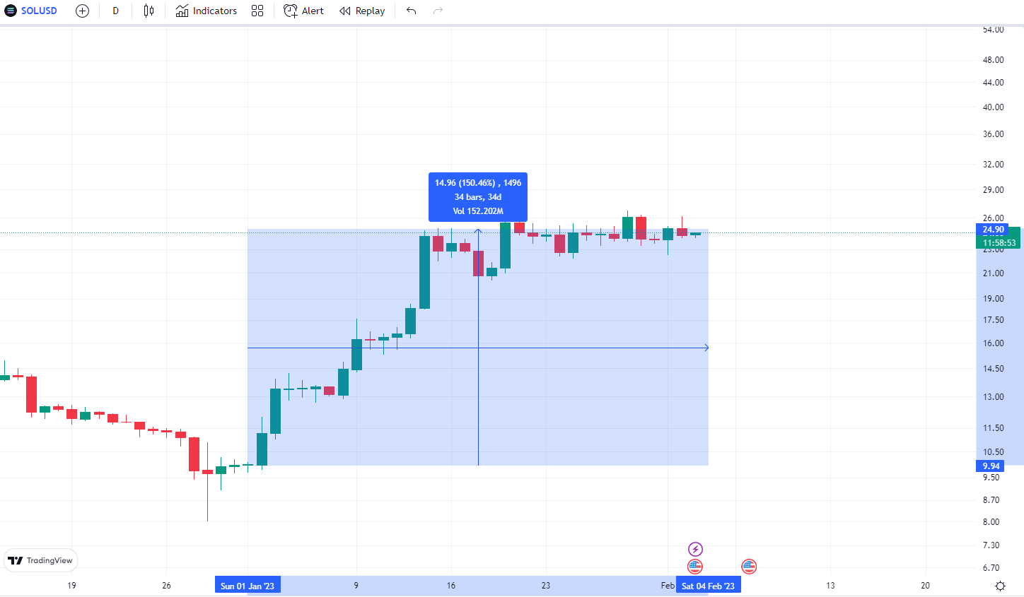 Out of the top 10 cryptocurrencies by market capitalization, Solana (SOL) had the highest growth in January with a remarkable 150% increase, while XRP (XRP) had the lowest increase at 15%.