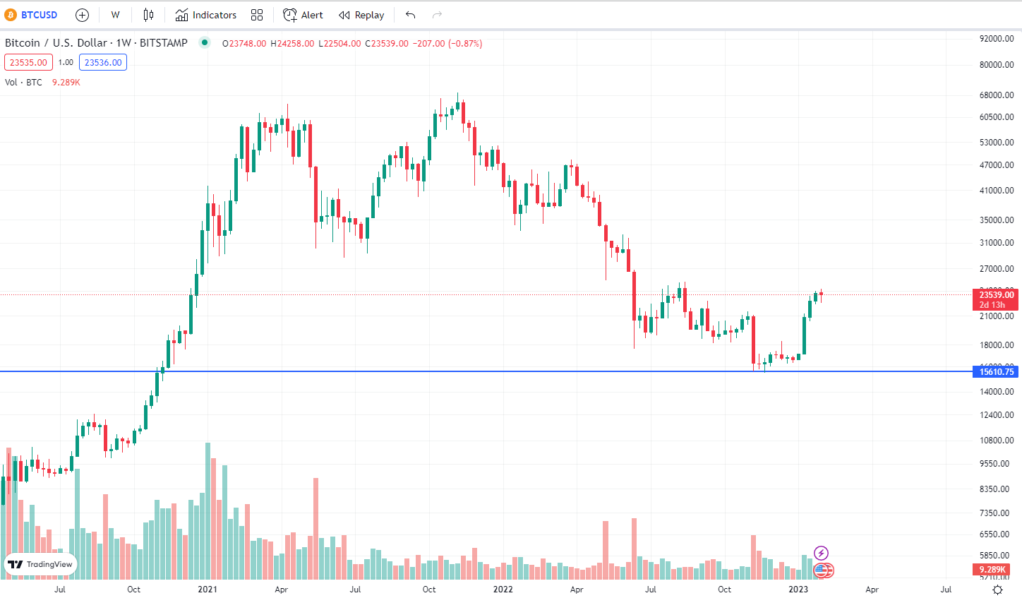 In November 2022, the price of Bitcoin (BTC) briefly fell to a two-year low below $15,600 due to the FTX bankruptcy filing. However, the cryptocurrency market regained its strength in early 2023 with a 37% increase in BTC prices to end the month of January at over $22,900. Ethereum (ETH) also saw a 30% rise in January, ending the month at $1,577.